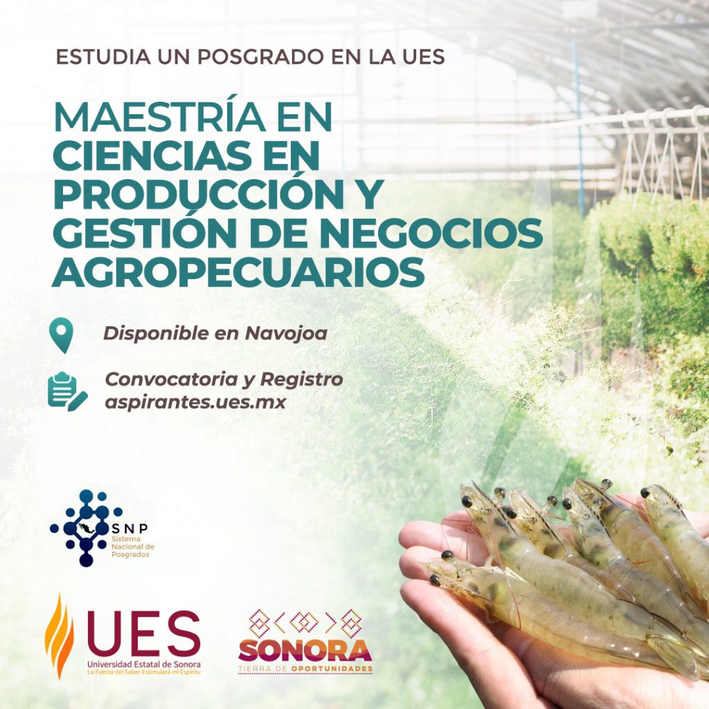 Por su parte, la Maestría en Ciencias en Producción y Gestión de Negocios Agropecuarios se imparte en la UES Navojoa y está dirigida a egresados de licenciaturas administrativas, tecnológicas o biológicas con interés en proyectos de investigación o desarrollo tecnológico que fortalezcan la eficiencia y sustentabilidad del sector agropecuario.