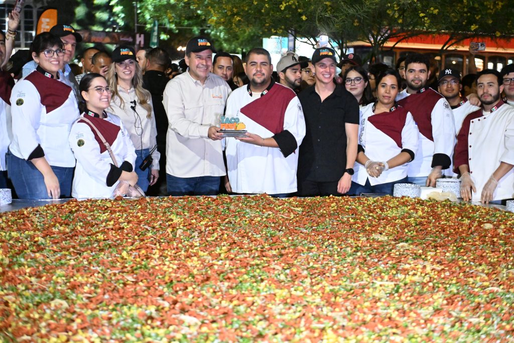 En el marco del séptimo aniversario de Víactiva, Toño Astiazarán junto a Oscar Gastélum Donnadieu, director de la Agencia Municipal de Desarrollo Económico (AMDE) y Fernanda Cisneros Rodríguez, directora de Desarrollo Turístico de la AMDE recorrió los 50 puestos instalados que ofrecieron una amplia variedad de tacos de carne asada y al pastor, así como también conocer el Taco Más Grande de La H elaborado por la Universidad Vizcaya de Las Américas con carne al pastor en un diámetro de 4 metros.